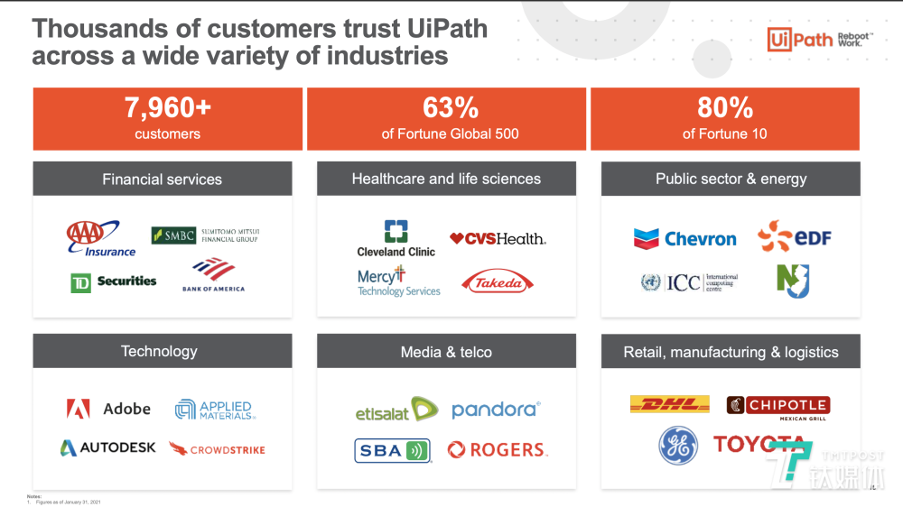 (Image source: UiPath) On April 21, local time, UiPath, an American AI machine processing automation technology developer and enterprise-level RPA software giant, successfully landed on the New York Stock Exchange under the stock code “PATH”. UiPath’s opening stock price was 65.50 US dollars per share, which was an increase of about 17% from the issue price of 56 US dollars per share. It broke through 70.40 US dollars in midday, and the intraday increase expanded to nearly 26%. As of press time, UiPath’s closing price on the first day was US$69 per share, an increase of more than 23%, and its market value reached US$35.8 billion. Prior to this, UiPath had publicly sold 23.9 million shares for US$56, raising nearly US$1.34 billion. If the underwriters use the green shoe mechanism to choose over-allotment, UiPath will create the third largest software IPO in the history of US stocks based on the total amount of listed financing, second only to Snowflake in September last year and Qualtrics in January this year. At the same time, this is another enterprise-level software unicorn entering the capital market following the successful listing of such giants as Zoom and Snowflake. Moreover, UiPath is the first RPA software platform to land on the US stock market with the highest market value. UiPath is headquartered in New York, USA, mainly for corporate customers to help them build and optimize their Robotic Process Automation (RPA) platform. To put it simply, the role of RPA is to maximize the use of it to replace or assist humans in completing repetitive tasks and tasks in digital devices such as computers, so as to achieve the goal of reducing costs and increasing efficiency and improving work efficiency. For example, in the invoice reimbursement scenario, a large number of invoices are normally sorted by human means, and then summarized into a form and submitted to the enterprise OA system, while the RPA platform directly makes a product interface for invoice collection and reimbursement requests. Employees only It needs to be uploaded by sorting folders, clicking on the relevant button, the platform will wake up the so-called “AI robot” behind it, and process the reimbursement process in an automated manner, simplifying the entire reimbursement process by machine. Main functions and features of RPA (Source: iResearch) In fact, the current RPA market is still relatively small compared to cloud computing, semiconductors and other race tracks. As of the end of 2020, the global RPA market is only about 17 billion US dollars, and it is expected to increase to 30 billion US dollars by the end of 2024. However, the importance of the RPA platform is that if a manufacturing company with a revenue of 20 billion U.S. dollars and 50,000 employees, 20% of its work flow can be completed with RPA automation, it can bring more than 3,000 to it every year. Ten thousand dollars in profit. Zhu Xiaohu, managing director of Jinshajiang Venture Capital Fund, pointed out at last year’s World Artificial Intelligence Conference that the RPA software and service market is a “unmanned economy” of tens of billions of dollars, with huge potential for commercial value. “UiPath’s successful listing means that the capital market can pay attention to and recognize more RPA companies, and it can also play an educational role for customers in various industries.” Liu Chungang, founder and CEO of Yunkuo Technology, said in an exclusive interview with Titanium Media App, Although all walks of life have very strong application requirements for RPA, domestic RPA companies are still in the niche circle of the corporate service track, and have not really “out of the circle.” If UiPath continues to improve in the capital market, it will help more people understand RPA track technology and enterprises. Founded in 2017, Yunkuo Technology is a domestic enterprise-level intelligent RPA platform provider headquartered in Shanghai. In March of this year, Yunkuo Technology completed the B+ round of financing invested by Flaming Capital. Prior to this, the company has received a total of more than 45 million U.S. dollars in investment from well-known investment institutions such as Sequoia Capital China Fund, Jinshajiang Venture Capital, B Trend Capital, and Shenzhen Venture Capital. Zhou Tianen, an analyst at Head Leopard Research Institute, told Titanium Media App that the listing of UiPath has positive significance for the industry. “Because of its high growth and high gross profit, it is extremely good among SaaS companies. UiPath proved that the revenue model based on licensing revenue, operation and maintenance and technical support is feasible and the business model has high potential; and, due to the penetration rate of RPA in China Low, UiPath’s good revenue growth model can prove that China’s RPA market space needs to be tapped, and domestic RPA companies may take the opportunity to accelerate their deployment.” Zhou Tianen said. High growth + high gross profit + high retention rate behind RPA star stocks The story of UIPath development began in 2005. Self-taught programmer Daniel Dines (Daniel Dines) chose to leave after working in the SQL server agent development department of Microsoft Corporation in Seattle for 5 years. He established the predecessor of UIPath DeskOver in Romania through the formation of a 10-person technical team. It mainly provides technical outsourcing consulting services for companies such as IBM, Microsoft, and Google, and also develops some automation products. In 2013, the Indian business process outsourcing (BPO) company hopes that DeskOver can provide its customers with software for automated tasks. Although Deans’ company does not focus on RPA technology, he sees business opportunities. Soon, DeskOver attracted the attention of Yahoo. In 2015, it received financing to develop an enterprise-level RPA platform, officially renamed “UiPath”, and fully transform