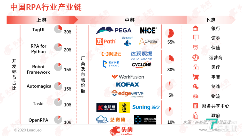 China RPA Industry Chain (Source: Head Leopard Research Institute) Zhou Tianen told the Titanium Media App that there are three main reasons for this: 1. RPA is an industry born according to the needs of enterprise applications. The digital transformation of the business process of large Chinese enterprises is later than that of the United States, and the demand for RPA is less. Therefore, the establishment of enterprises such as Cloud Expansion and Laiye is later than UiPath, and it is normal that the scale is smaller than that of international leading enterprises; 2. The penetration rate of China’s RPA market is still lower than that of countries and regions with high labor costs such as the United States and Europe, and the business volume of local RPA companies will be less and the pace will be slow; 3. It is difficult for local RPA suppliers to touch the market of competing multinational companies, whose RPA needs are all occupied by UiPath. For Chinese RPA suppliers, it is more difficult to compete with UiPath. However, Zhou Tianen also emphasized that the RPA needs of many local companies in China have yet to be developed. If the cloud expands and wins the market competition in this field, the size of the enterprise will be very considerable, and conservative estimates will very likely reach the scale of UiPath. In an exclusive interview with Titanium Media App, Liu Chungang said that the relative cheapness of labor costs and the adequacy of labor have led Chinese companies to use automated software systems to improve operational efficiency and accelerate digital transformation. The urgency of the demand is relatively higher than that of foreign companies. low. “Nowadays, with the country’s advocacy for accelerating the digital development of various industries and the growing demand for more agile tools for companies themselves to face internal and external challenges, corporate executives have begun to pay attention to RPA technology. This is a very critical signal for change.” Liu Chungang It is believed that good companies never lack investment, and Chinese RPA companies will continue to grow rapidly. The fact is that the focus of enterprises has begun to shift from integrating external resource elements to tapping internal management. Actively looking for tools to improve internal management efficiency is a key element for enterprises to optimize processes and improve labor productivity. Therefore, RPA software is on the eve of a full-blown explosion. Liu Chungang emphasized that as Chinese companies continue to increase their demand for digitalization, intelligence, and informatization, a giant like UiPath will surely appear on the RPA track in China in the future. This is what he believes. However, he did not mention who will eventually become the Chinese version of UiPath. (This article first published Titanium Media App, author|Lin Zhijia, editor|Gai Hongda)