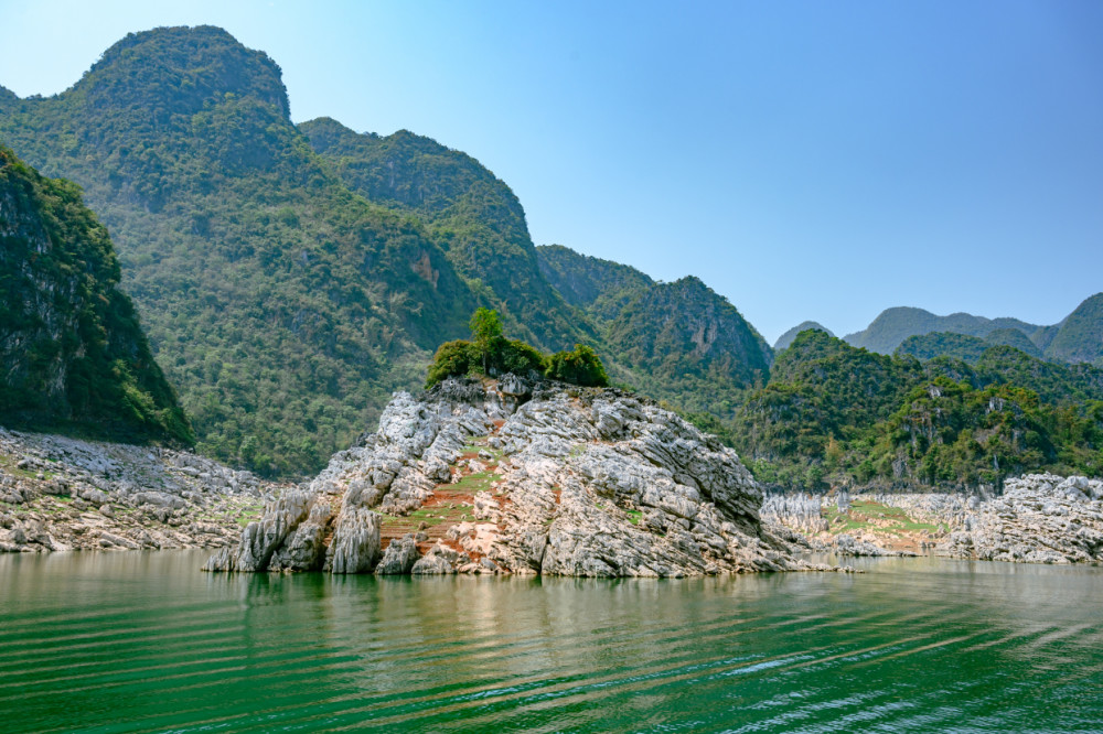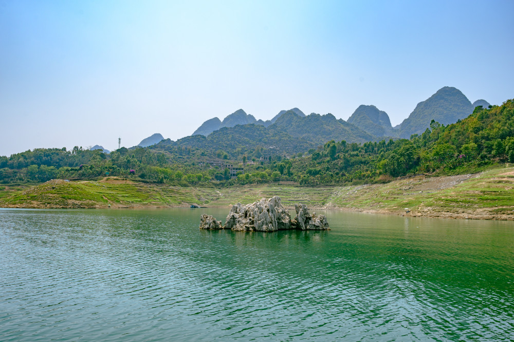 Compared with the landscape of Guilin, the popularity here is much lower, but its scenery is comparable to that of Guilin! Wanfeng Lake is located about 35 kilometers southeast of Xingyi City. It takes about an hour to drive from the city to this place. Perhaps because of its remoteness, I know that there are not many tourists here or here, but there are not many people. Great place in Jingmei. The predecessor of Wanfeng Lake was the rebellious Nanpan River. In 1991, due to the construction of the Tianshengqiao Hydropower Station, after the completion of the high dam, the river was blocked by the hydropower station, thus forming the Wanfeng Lake with blue waves. As a national key hydropower project, the Tianshengqiao Hydropower Station perfectly solves the electricity problem in the southwest region, and thus promotes the economic development of Guangxi, Yunnan, Guizhou and other provinces.