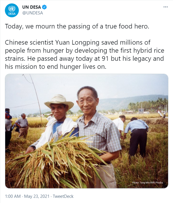 The United Nations Department of Economic and Social Affairs tweeted: “Today, we cherish the memory of a true food hero. Chinese scientist Yuan Longping has freed millions of people from hunger by breeding the first hybrid rice variety. He died today, at the end of the year. 91 years old, but his legacy and mission to end hunger will continue.” Singapore’s South China Morning Post published a report entitled “People pay tribute to Yuan Longping who helped China get rid of hunger”, and mentioned that the United Nations praised Yuan Longping for his contribution to food security and poverty eradication. Japan’s “Nikkei Asian Review” issued an obituary for Yuan Longping. The article stated that for more than half a century, Yuan Longping has been committed to the research and development of rice breeding in order to increase food production and has made great contributions to solving China’s food problems.