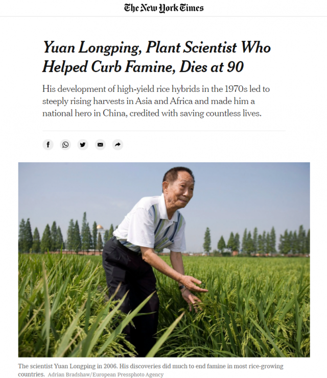The “New York Times” published a long article reviewing Yuan Longping’s life, saying that “the high-yield hybrid rice he developed in the 1970s has greatly increased the output of Asia and Africa and saved countless lives.” “Yuan Longping’s research has made him A national hero, he is also a symbol of China’s pursuit of science.”