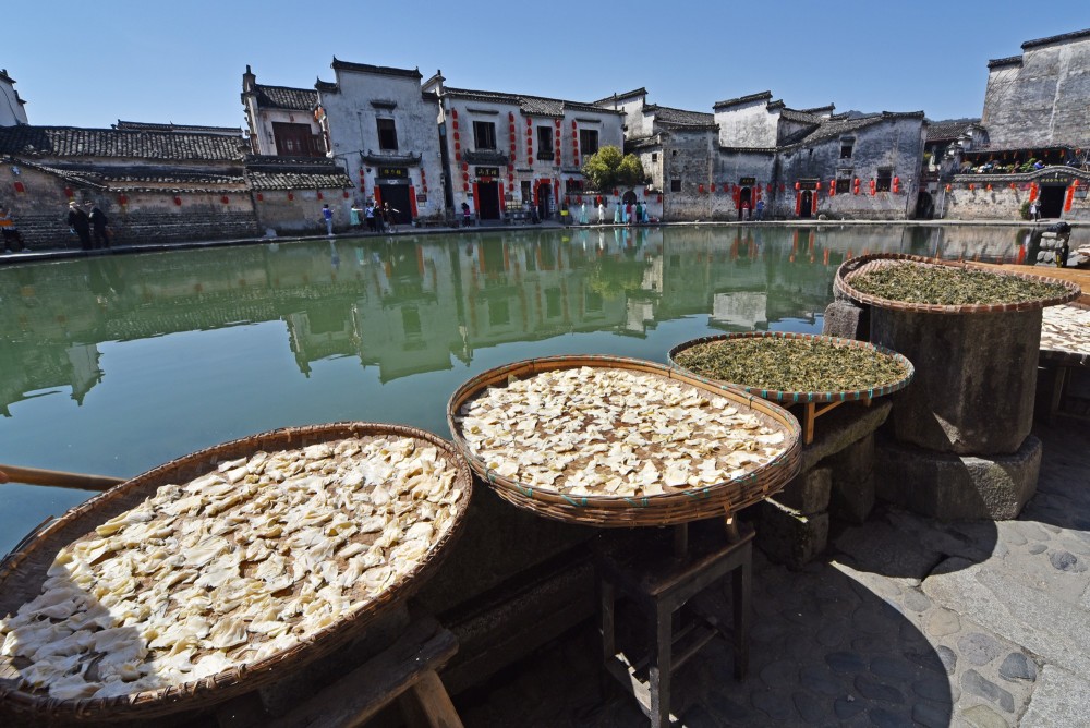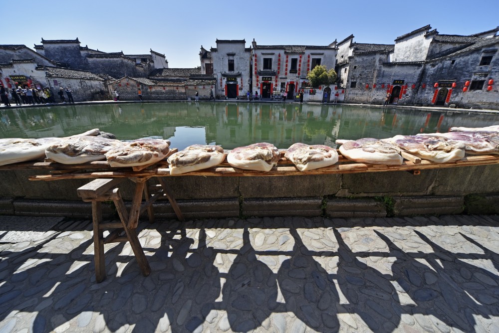 Anhui cuisine is one of the eight major cuisines. It is based on cooking, stewing, braising, steaming, smoked and other techniques. It is salty and fresh, respects the original taste, pays attention to firework, pays attention to food supplements, and has a unique style. As the business of Huizhou merchants grows bigger and bigger, as a hometown dish for entertaining guests, Hui cuisine is spread all over the place and has a profound influence. In Hongcun, it is of course indispensable to taste the local flavor. By the side of the moon marsh, the ingredients being dried have attracted great interest from passing tourists, and they have already begun to figure out the lunch and evening dishes.