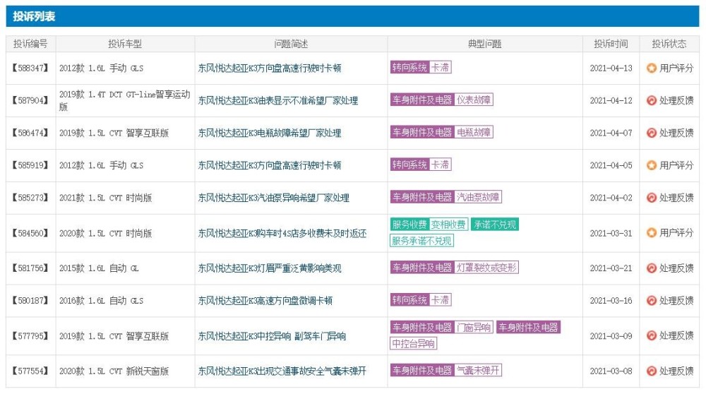 Finally, there are many complaints about the cash Kia K3. On the vehicle quality network platform, complaints about the uncomfortable shock absorption of the Kia K3 suspension, abnormal noise in the central control, abnormal noise in the car, abnormal noise of engine stalling, and audio-visual system failure have been high.