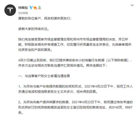 The following is the full text: Dear customers, netizens and media friends: Thank you for your continued attention. We fully accept the decisions of the State Administration of Market Supervision and Zhengzhou Municipal Market Supervision Administration, and do our best to actively cooperate with all relevant investigations, effectively fulfill the main responsibility of quality and safety, and provide consumers with high-quality and safe products and services. As of April 21, we have provided complete driving data (hereinafter referred to as the data) half an hour before the accident, and have proactively contacted and communicated with related parties and reported relevant situations on many occasions. The specific progress is as follows: 1. Communicating progress with the family of the client Ms. Zhang 1. In order to negotiate with customers as soon as possible on the time and form of data provision, on the afternoon of April 22, 2021, our staff contacted Ms. Zhang’s husband several times by phone and text messages, but no reply was received. 2. In order to provide customers with the required data as soon as possible, on the afternoon of April 22, 2021, our company will send the sealed paper version of the data to Ms. Zhang’s registered contact address in our company by express mail, a total of 48 pages , 6697 articles. 3. On the afternoon of April 22, 2021, our customer support department sent the electronic version of the data to Ms. Zhang’s personal mailbox registered in our company via company email. 2. Communicating progress with Zhengzhou Municipal Market Supervision Administration 1. On the afternoon of April 21, 2021, our company took the initiative to communicate with the Zhengdong New District Market Supervision Administration of Zhengzhou City (hereinafter referred to as the Zhengdong New District Municipal Supervision Bureau); at 18:00, our company went to the Zhengdong New District Municipal Supervision Bureau to receive the order as required Rectification notice. 2. At about 11 am on April 22, 2021, our company went to Zhengdong New District Municipal Supervision Bureau to communicate and provide written materials. Zhengdong New District Municipal Supervision Bureau requires our company to provide data directly to customers. 3. During April 21 and 22, 2021, our company communicated with the relevant work comrades of the Zhengdong New District Municipal Supervision Bureau responsible for handling this case many times and submitted application letters, urging third-party appraisal agencies to intervene in the matter and express our willingness to undertake All costs incurred in the appraisal. At present, we have not received any opinions on whether the client concerned agrees to conduct a third-party appraisal, or any suggestions on choosing a specific appraisal and testing agency. In the next step, we will continue to contact customers sincerely and actively, respect the wishes of consumers, and promote the safe resolution of incidents. We have implemented the requirements of the State Administration of Market Supervision and Administration and the Zhengzhou Municipal Market Supervision Administration in the first time strictly and item by item, safeguarded the vital rights and interests of consumers with practical actions, and sincerely won the understanding and support of consumers. We promise once again that we will unreservedly cooperate with the regulatory authorities to carry out in-depth investigations and openly accept social supervision. We are willing to jointly witness with the consent of the customer, government designation or supervision, and conduct testing at any qualified and authoritative testing organization across the country. Thank you again for your understanding. Zhengzhou City Market Supervision Administration: Receive data when both parties are present According to JiMu News, at 5:46 pm on April 22, related Tesla staff told reporters that they had already taken the official seal data to the Zhengzhou Municipal Market Supervision Administration on the morning of the 22nd, but the staff of the bureau suggested that, It is up to the owner of the car involved to dock and receive.