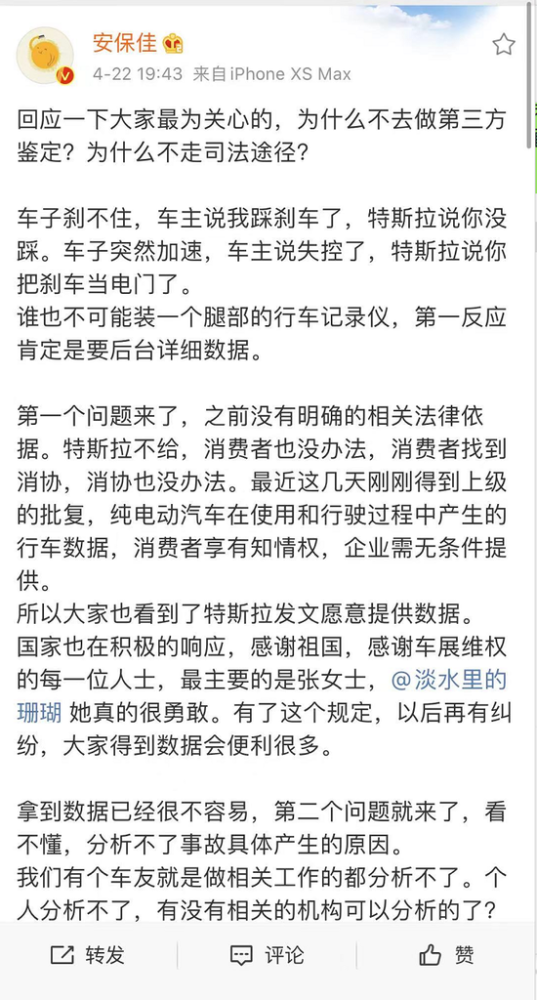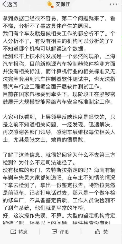 Tesla’s person responsible for handling the accident said: “We have sent the data email to the customer. The customer has not answered the phone. (We are) sent it to the email address the customer filled in when they bought the car through the company email.” New voice from Tesla rights defenders: Detection cannot keep up with technological development Soon after Tesla announced the situation one minute before the data restoration accident, another car owner, An Baojia, who participated in the rights protection, uttered a voice on Weibo, responding to why he did not perform a third-party appraisal. He said that “testing cannot keep up with technology” and it is difficult for authoritative appraisal agencies to be the dilemma faced by car owners after the current smart car controversy.