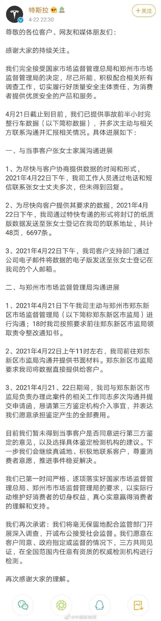 Mr. Li, the husband of the female rights defender, believes that the driving data is personal property and personal privacy, and Tesla has disclosed it to the media and the public without the owner’s permission, which he cannot accept. On April 22, Tesla disclosed to the media the driving data one minute before the accident and made a text explanation. Subsequently, Mr. Li, the husband of the female car owner, responded late at night that he violated the owner’s personal privacy and consumer rights and would immediately file a complaint with the Zhengzhou City Market Supervision Department. Video source: Elephant News Tesla’s person responsible for handling the accident stated that the data had been sent to the customer by email. Since the customer’s phone number has not been answered, Tesla sent it to the customer’s mailbox when they bought the car through the company’s mailbox. “My wife is still in the detention center and the mobile phone is in the hands of the police. How can I receive a call?” Mr. Li said that before Tesla released the data one minute before the vehicle accident to the public, he had never obtained it with Zhang’s family. Over contact. Mr. Li only talked to the relevant person in charge of the Zhengdong New District Market Supervision and Administration Bureau of Zhengzhou City on the afternoon of the 22nd. The person in charge only told Mr. Li that Tesla had been ordered to provide data to the car owner and did not mention driving data. Released through the media. Tesla released the driving data without any communication with the car owner. After seeing the news, Mr. Li was very surprised, “This has violated our personal privacy and consumer rights.” Mr. Li was first right. The driving data presented by Tesla expressed disapproval. At the same time, he believed that the driving data belonged to personal property and personal privacy, and Tesla disclosed it to the media and the public without the owner’s permission, which he could not accept. In the next step, Mr. Li will file a complaint with the Zhengzhou Municipal Market Supervision Administration, and at the same time ask Tesla to apologize publicly and revoke the driving data. Previously reported Recently, Tesla owners’ rights protection at the Shanghai Auto Show continued to ferment. On the 19th, at the 2021 Shanghai Auto Show, a Tesla car advocated that a woman wearing a T-shirt with the words “brake failure” stood on the roof of a Tesla to defend her rights, and then was taken away. Ms. Zhang said that her father had a traffic accident due to a brake failure while driving a Tesla. She said that her father had slammed on the brakes, but to no avail. Video screenshot Therefore, before, Ms. Zhang also carried out rights protection at the Zhengzhou Auto Show. On the 20th, the relevant person in charge of the Press and Publicity Department of the Zhengzhou Market Supervision Bureau responded that the Zhengdong New Area Market Supervision Bureau organized the complainant and Tesla car sales services three times on March 15, March 18, and March 24 ( Zhengzhou) Co., Ltd. conducted mediation. The complainant disagrees with a third party’s technical appraisal and requested “to provide complete driving data half an hour before the accident occurred. Tesla Motors Sales Service (Zhengzhou) Co., Ltd. refused to provide relevant data because of concerns that the data would be used by the parties for hype and publicity. Due to the large differences between the two parties, they could not reach an agreement. Subsequently, on the 21st, the Zhengdong New District Market Supervision and Administration Bureau of Zhengzhou City responded again and stated that it ordered Tesla Motors Sales Service (Zhengzhou) Co., Ltd. to unconditionally provide Ms. Zhang with complete driving data half an hour before the accident. In the evening of the same day, Tesla expressed its willingness to cooperate fully and provide raw data of the vehicle half an hour before the incident to a third-party appraisal agency or government-designated technical supervision department or consumers. Image source: Upstream News Tesla releases raw vehicle data On the 22nd, Tesla officially announced the original vehicle data half an hour before the incident. Tesla said that data showed that in the 30 minutes before the accident, the vehicle had more than 40 records of depressing the brake pedal. At the same time, the vehicle has repeatedly exceeded 100 kilometers per hour, and multiple brakes have occurred. When the driver stepped on the brake pedal for the last time, the data showed that the speed of the vehicle was 118.5 kilometers per hour. Within 2.7 seconds after the driver stepped on the brake pedal, the maximum brake master cylinder pressure was only 45.9 bar. After that, the driver increased the stepping on the brake pedal, and the brake master cylinder pressure reached 92.7 bar. The front collision warning and automatic emergency braking function were activated (the maximum brake master cylinder pressure reached 140.7bar) and played a role, reducing the amplitude of the collision. 1.8 seconds after the ABS was applied, the system recorded the occurrence of the collision. After the driver stepped on the brake pedal, the vehicle speed continued to decrease, and before the collision, the vehicle speed was reduced to 48.5 kilometers per hour. Tesla said that, in summary, the vehicle is driving at a higher speed, and the driver starts to depress the brake pedal lightly. After that, the automatic emergency braking function is activated and has a function, which improves the braking force and reduces The impact force of the collision, the brake system are normally involved in the work and reduce the speed of the car. Tesla speaks again: Will cooperate with investigation without reservation On the evening of the 22nd, Tesla’s official Weibo issued a statement stating that it fully accepts the decisions of the State Administrati