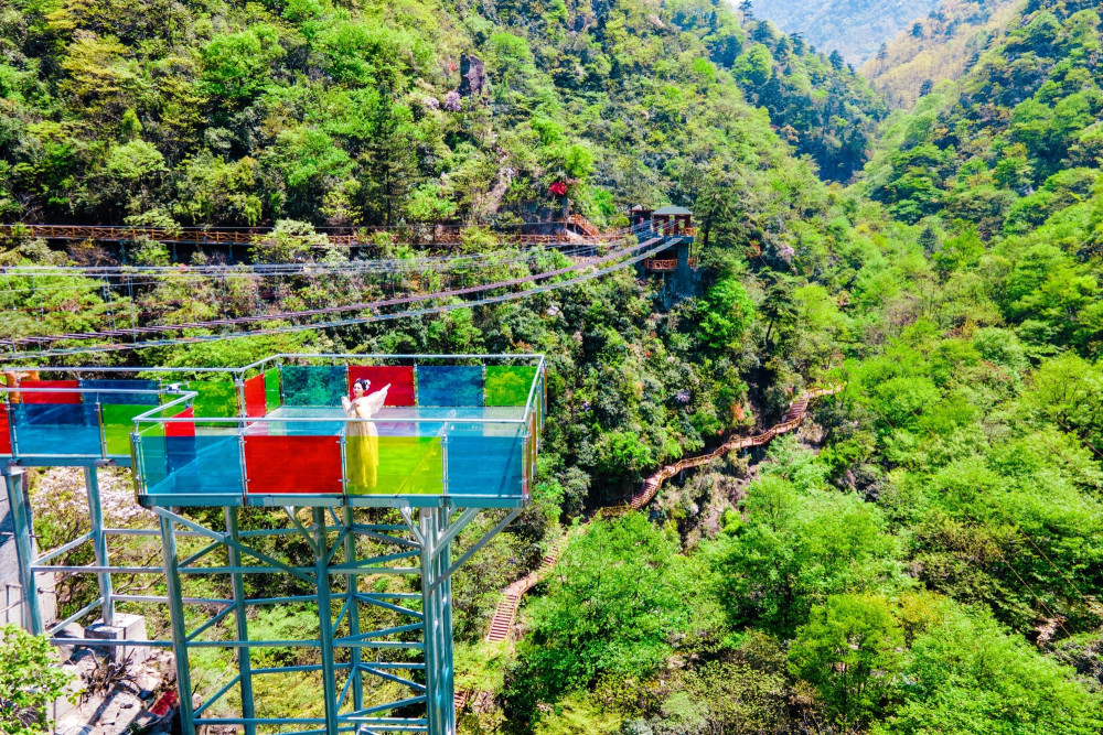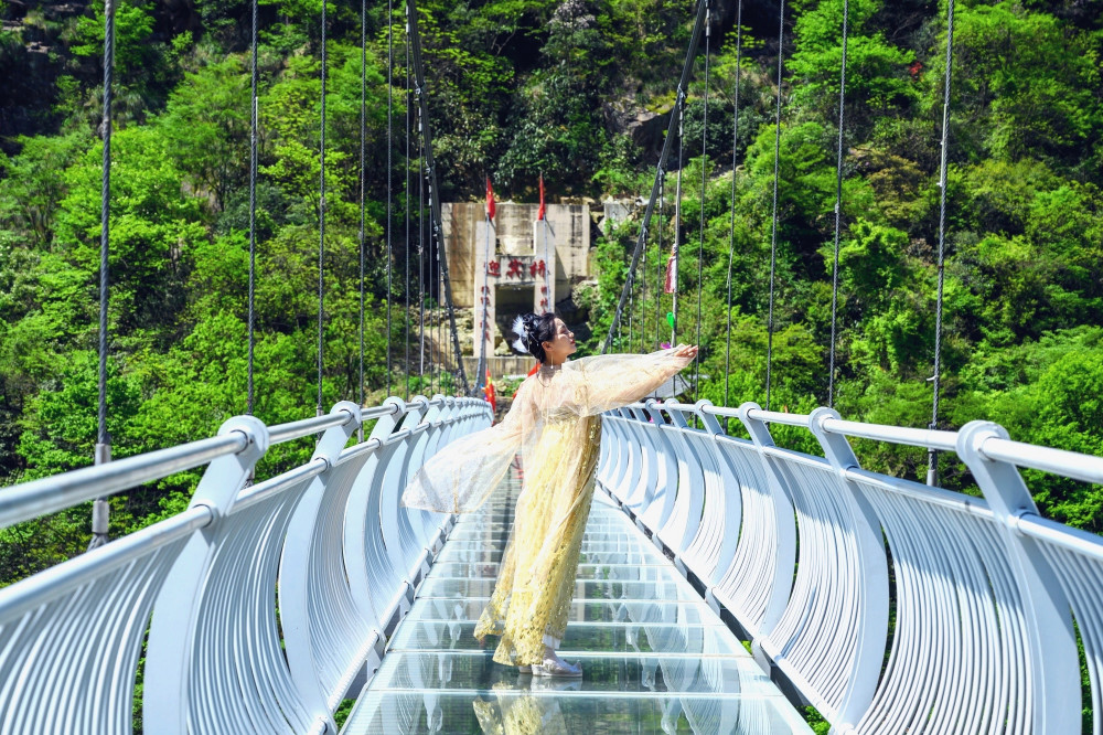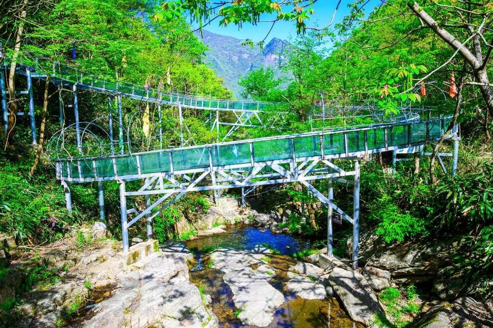 This high-altitude glass suspension bridge is the first 7D glass skybridge in Anji County. It has a total length of 170 meters and a drop of 107 meters. Walking on the glass bridge gives people a sense of excitement. The magnificent scenery has a panoramic view.