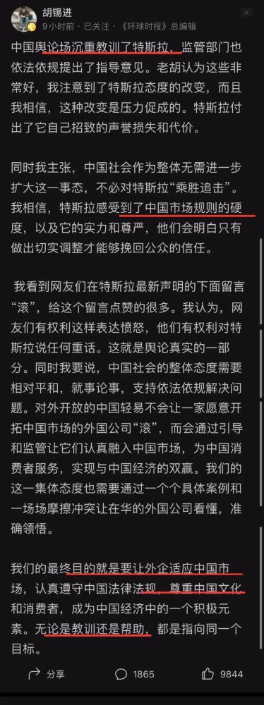 “The Chinese public opinion field taught Tesla a heavy lesson,” Hu Xijin said. Seeing this sentence, I am very worried about the public opinion field. The Tesla brake issue is a dispute between merchants and consumers. The reason why it was caused by the state’s authoritative media and the state judicial department. What does this mean?