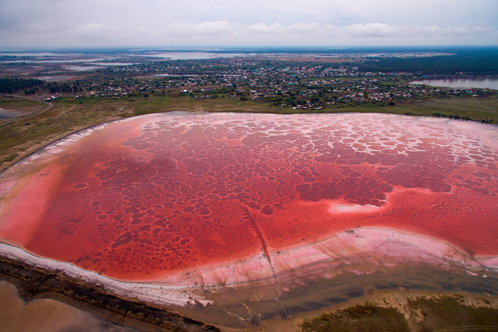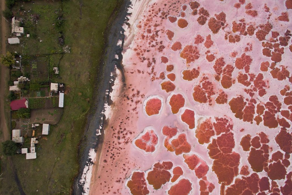 The dark red color is related to the microorganisms in the lake. This is a kind of Serratia bacterium that lives in salt lakes. It is a pink or red microbe. Our common pink lakes are mostly caused by the presence of Serratia in the bottom of the water, except for iron.