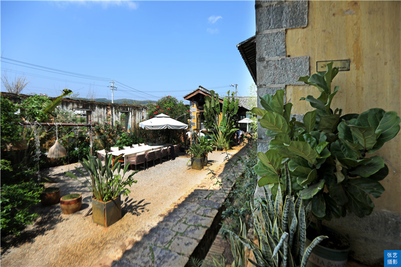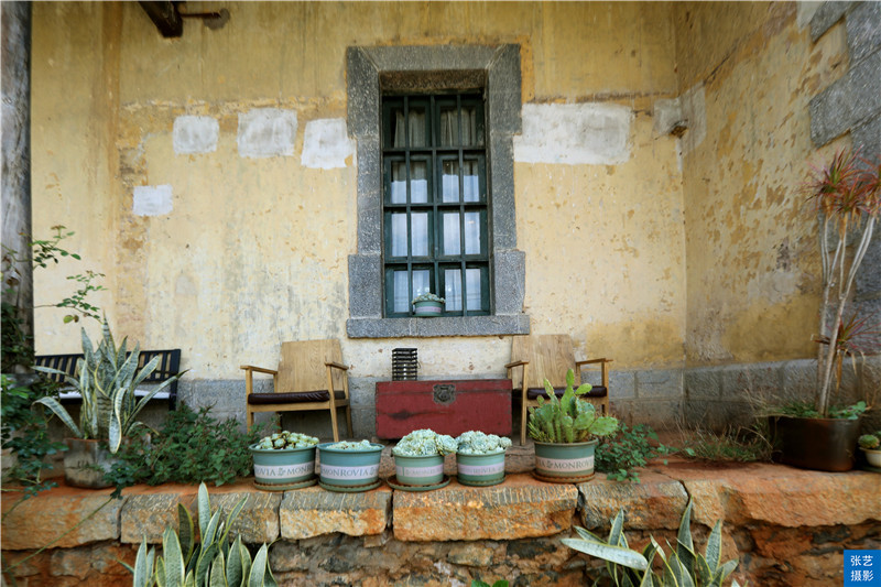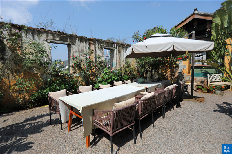 Behind the station is a large patio with a lot of flowers and plants on the side. The surrounding walls are a bit ragged, but many tourists like this kind of building with a sense of age. There is a row of tables and stools in the middle of the patio, and there are many flowers on the table. Tourists eat tea, drink coffee and take photos here.
