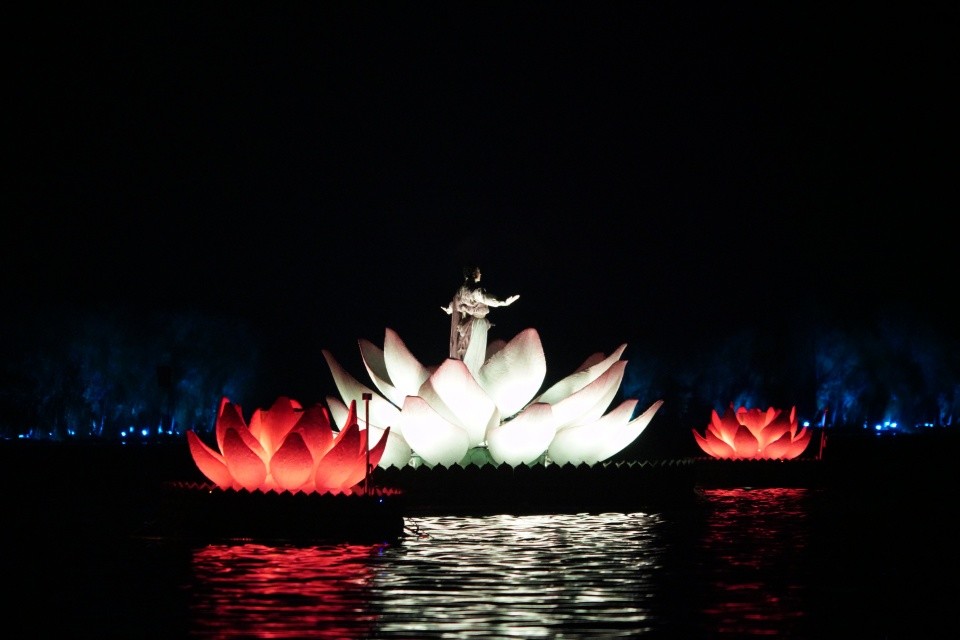 There are some beautiful things in the world, but they can’t be met. It coincided with the advent of “One Dream of Qin Lake”, we were fortunate to watch the night tour of Qin Lake that can be compared to the “Venice of the Water City”. “A Dream of Qin Lake” starts from the Qin Lake Pier, and travels along the route through “Nine Dragons Chaoque”, “Pagoda of Medicine Master”, “Liu Li Zen”, “Dian Jiang Tai”, “South Tower Reading”, “Guzhen Xinxin” Scenic spots such as “Rhyme” reproduce the poignant mythical story of Qinhu Lake through the expression of water curtain projection, water light show, water dance, and drone phalanx. Under the colorful lights, the glazed Zen rhyme of the slender Buddha statue on the lake surface is clearly visible. When the cruise ship circumnavigated the pagoda half a circle, many travellers clasped their hands to worship, hoping for good luck and prosperity.