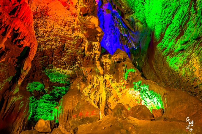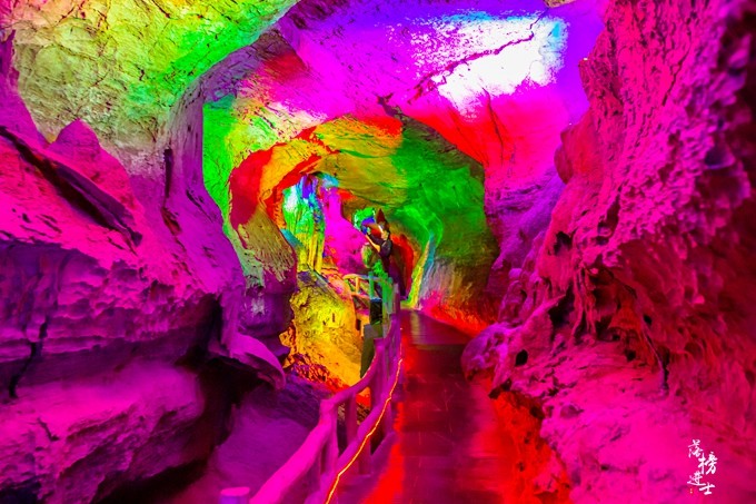 Walking in the canyon, sometimes the road is flat and spacious, sometimes narrow and cramped, sometimes up, sometimes down. Some stalactites are high above and far away, some are close and within reach. The lights show brilliant colors, red and orange, orange sprinkled with yellow, yellow with blue, blue with green, green with blue, blue Covered with purple, the walls of each square gorge are soaked with color, like an ambiguous color picture.
