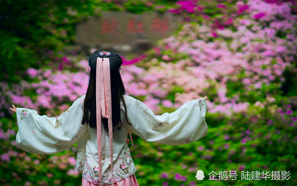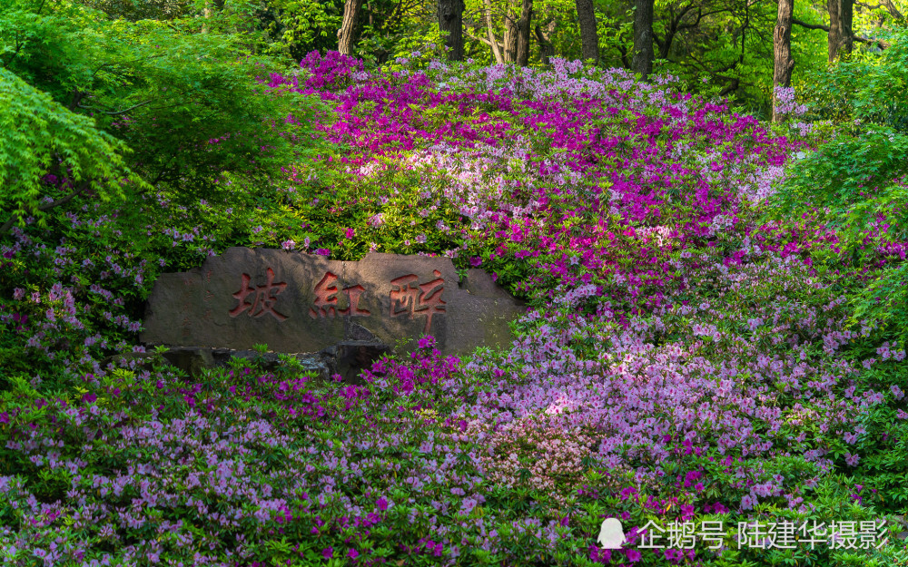 The most worth checking-in attraction in the Rhododendron Garden is called “Drunk Red Slope”. It is located at the inner end of the gazebo. The pavilion is connected to a “Yunjintang”. Good location. “Drunk Red Slope” is a hillside built with stones. A large bloom of azaleas of red, white and blue are pouring out from the top of the slope, like a waterfall of azaleas. Among the flowers, there is a huge piece of azalea. The stone is carved with the words “Drunk Red Po”, which is taken from the late Tang poet Han Mura, Huiang, Jie Dianluan and Yin Ba Nahuan.