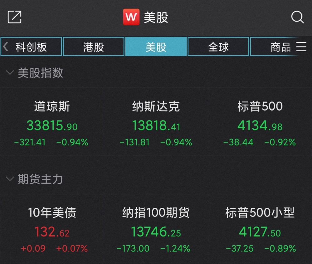 Screenshot source: Wind Specifically, as of the close, the Dow fell 321.41 points, or 0.94%, to 33815.90 points; the Nasdaq fell 131.81 points, or 0.94%, to 13818.41 points;S&P 500The index fell 38.44 points, or 0.92%, to 4134.98 points. U.S. stocks’ large technology stocks fell across the board,appleFell 1.17%,AmazonFell 1.58%,NetflixFell 0.02%,GoogleFell 1.13%, Facebook fell 1.64%,MicrosoftFell 1.31%. Bank stocks fell across the board, JPMorgan Chase fell 2.06%,Goldman SachsFell 1.29%,CitiDown 1.16%,Morgan StanleyFell 1.26%,Bank of AmericaFell 0.9%,FuGuo bankFell 1.23%. Energy stocks fell across the board,Exxon MobilFell 1.25%,ChevronFell 1.76%,ConocoPhillipsFell 1.14%,SchlumbergerFell 1.75%,Occidental PetroleumFell 1.47%. Popular Chinese concept stocks have mixed ups and downs.Big new energyUp 14.14%,TouchPal Technology (CTK.US)Up 9.86%,RenrenUp 8.28%,1 Medicine NetUp 7.11%,PinduoduoUp 3.61%,JingdongUp 0.52%,Sina WeiboUp 0.51%;Lots of roomsDown 11%,Learn fromFell 9.17%,Hong En EducationFell 6.55%,Canaan TechnologyFell 4.43%,AliFell 0.07%,Baidu GroupFell 0.04%. New energy auto stocks went up and down mixed,NIO (NIO.N)The car rose by 1.75%,Xiaopeng MotorsFell 0.74%,Ideal carRose 1.31%. In the news, it was reported that US President Biden proposed to impose a capital gains tax of up to 43.4% on the wealthy. In European stock markets, the London Stock Market “Financial Times” average price index of 100 stocks closed at 6938.24 points, an increase of 42.95 points or 0.62% from the previous trading day. The CAC40 index of the Paris stock market in France closed at 6,267.28 points, an increase of 56.73 points or 0.91% over the previous trading day.Frankfurt Stock MarketGerman DAX IndexIt closed at 15320.52 points, an increase of 124.55 points or 0.82% over the previous trading day. In terms of international oil prices, West Texas Intermediate (WTI) futures for June delivery on the New York Mercantile Exchange rose 8 cents, or 0.1%, to close at $61.43 per barrel; LondonIntercontinental Exchange (ICE)The price of Brent crude oil futures for June delivery rose 8 cents, or 0.1%, to close at $65.40 per barrel. In terms of international gold prices, the most active June gold futures price on the New York Mercantile Exchange gold futures market fell by 11.1 U.S. dollars from the previous trading day to close at 1,782 U.S. dollars per ounce, a decrease of 0.62%. As of the end of the New York trading session, the US dollar index, which measures the US dollar against six major currencies, rose 0.20% to 91.3389. (Zhongxin Jingwei APP)
