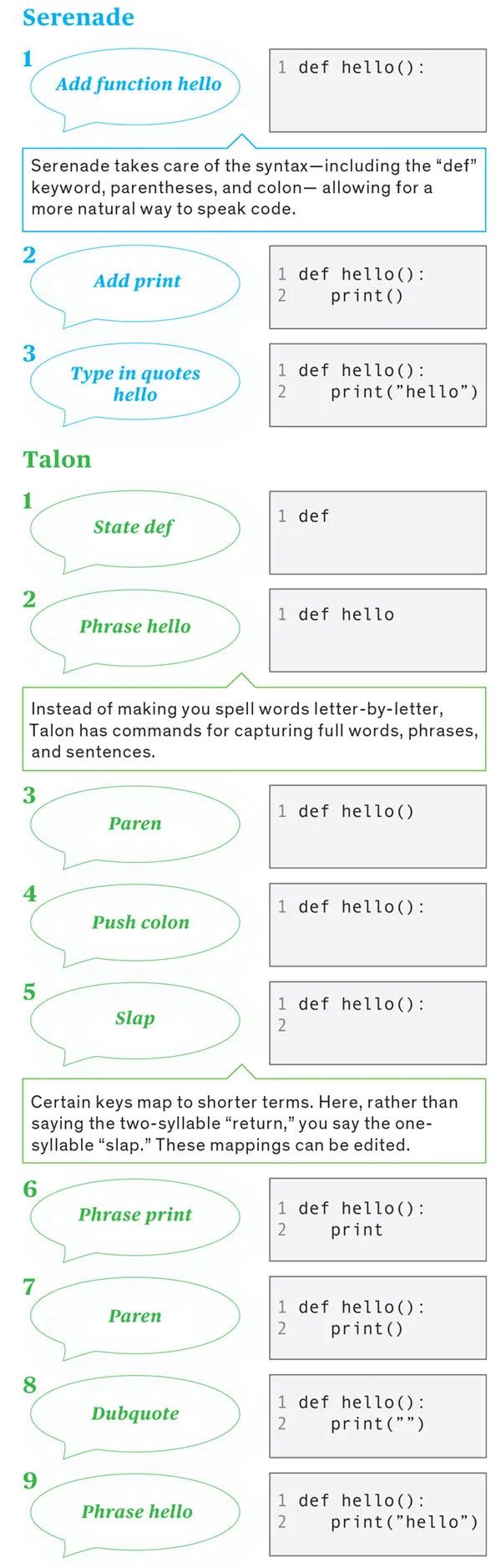 Translator | Sambodhi Planning | Liu Yan In the programmer community, there is such a special group-blind programmers. Blind programmers rely on screen readers, braille displays, etc. to help write code. And for those programmers who suffer from hand diseases, they can’t use the keyboard, how to program? From speech to code : There are two leading language programming platforms today, which provide different ways to “reciting” codes to the computer. One of them is called Serenade, which is a bit like a digital assistant: it allows you to describe the instructions you are writing code without requiring you to dictate each instruction verbatim; the other is called Talon, which provides more fine-grained control over each line. It also requires a more detailed understanding of each task programmed into the computer. A simple example in this article is a step-by-step guide for generating Python code in Serenade and Talon, which will print “hello” on the screen. Through conversations with gadgets, we communicate with them Interactions are becoming more frequent . Nowadays, old friends like Alexa and Siri have joined the ranks of car assistants like Apple CarPlay and Android Auto, and even joined apps that are sensitive to voice biometrics and commands. But what if the technology itself can be built with voice? That is the premise of voice programming. Voice programming is a software development method that uses voice instead of keyboard and mouse to write code. On the voice programming platform, programmers “speak” commands to manipulate the code, creating custom commands that adapt and automatically execute the workflow. Voice programming is not as simple as it seems, there are many complicated technologies behind it. For example, Serenade, a speech programming application, has a speech-to-text engine developed specifically for code. Unlike Google’s speech-to-text API, it is designed for conversational speech. When the software engineer speaks the code, Serenade’s engine feeds it back to the natural language processing layer, and its machine learning model is trained to recognize and convert common programming structures into syntactically effective code. Serenade raised $2.1 million in its seed round in 2020. When co-founder Matt Wiethoff was diagnosed with repetitive force injury (RSI) in 2019. Common occupational diseases), Serenade came into being. “I gave up my position as a software engineer at Quora because I can’t do this job anymore,” he said. “Either choose a job that doesn’t have to type so many words, or come up with some solutions.” Ryan Hileman also followed the same path. After suffering from hand pain a year ago, he quit his full-time job as a software engineer in 2017. So Hileman started to create Talon, a hands-free programming platform. He said: “Talon’s purpose is to completely replace the keyboard and mouse.” Talon has several components: speech recognition, eye tracking, and noise recognition. Talon’s speech recognition engine is based on Facebook’s Wav2letter automatic speech recognition system, which Hileman has expanded to adapt to voice programming commands. At the same time, Talon’s eye tracking and noise recognition functions can simulate using a mouse to navigate, move the cursor on the screen according to eye movements, and click according to the popping sound of the mouth. “This kind of sound is easy to make. This method is effortless and only requires a low delay to be recognized, so this nonverbal way of clicking the mouse is faster and does not cause sound fatigue.” Hileman said. Programming with Talon sounds like speaking in another language, software engineer and speech programmer Emily Shea said during a conference speech in 2019. Her speech video is full of voice commands, such as “slap” (click enter), “undo” (delete), “spring 3” (go to the third line of the file), and “phrase name op equals snake extract word paren mad” (the result is this line of code: name = extract_word(m)). When programming with Serenade, it follows a more natural way of speaking code. You can say “delete import” to delete the import instructions at the top of the file, or “build” to run custom build commands. You can also say “Add function factorial” to create a function, calculate the factorial in JavaScript, and the application will process the syntax-including the “function” keyword, parentheses and braces-so you don’t need to explicitly declare each element.