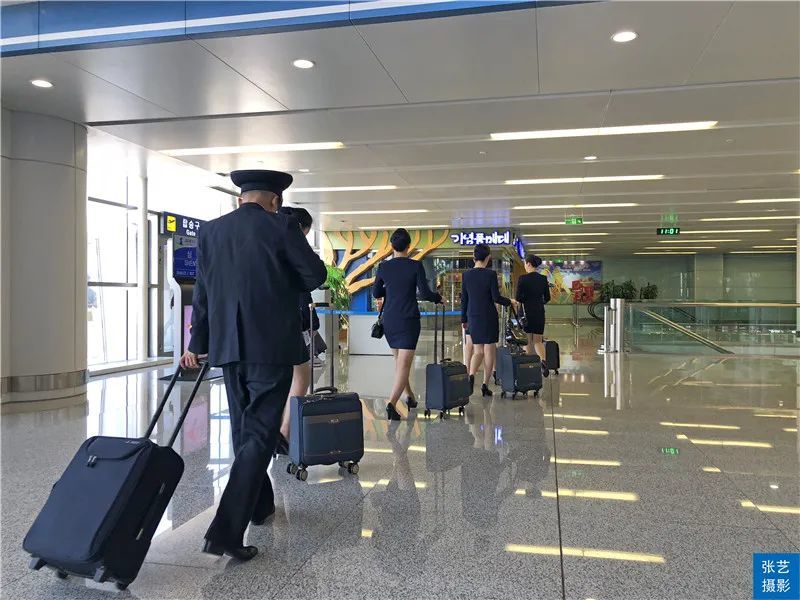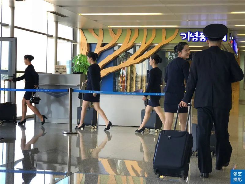 The neatly-dressed North Korean Airline flight attendants, each holding a uniform black suitcase, lined up into the airport lobby, very eye-catching.