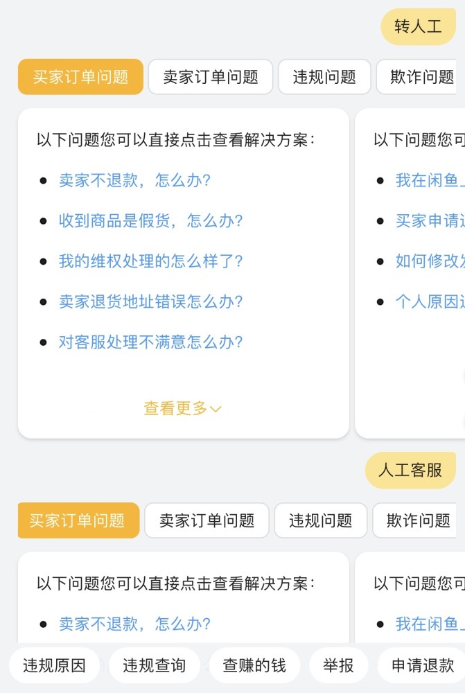 “Where is the customer service of this platform?” In the end, the search engine gave the answer. It turned out that the image of the villain next to the small gear was the customer service entrance. From the outside, this villain doesn’t have an iconic headset. It’s hard to think of what it has to do with customer service. Sometimes, even if you find a customer service after all the hard work, you will not be able to switch to manual service in the end. On a second-hand transfer platform, the reporter clicked on the “Customer Service Center”, and the “quick tools” were given at the top of the page, including fund unfreezing, consultation progress, reporting feedback, violation appeals, etc., and then listed some of the “hot concerns” issues. Turning to the bottom of the page, I finally saw the words “Contact Customer Service”. After selecting the type of question I want to consult, the “Smart Assistant” still pops up with a series of questions.