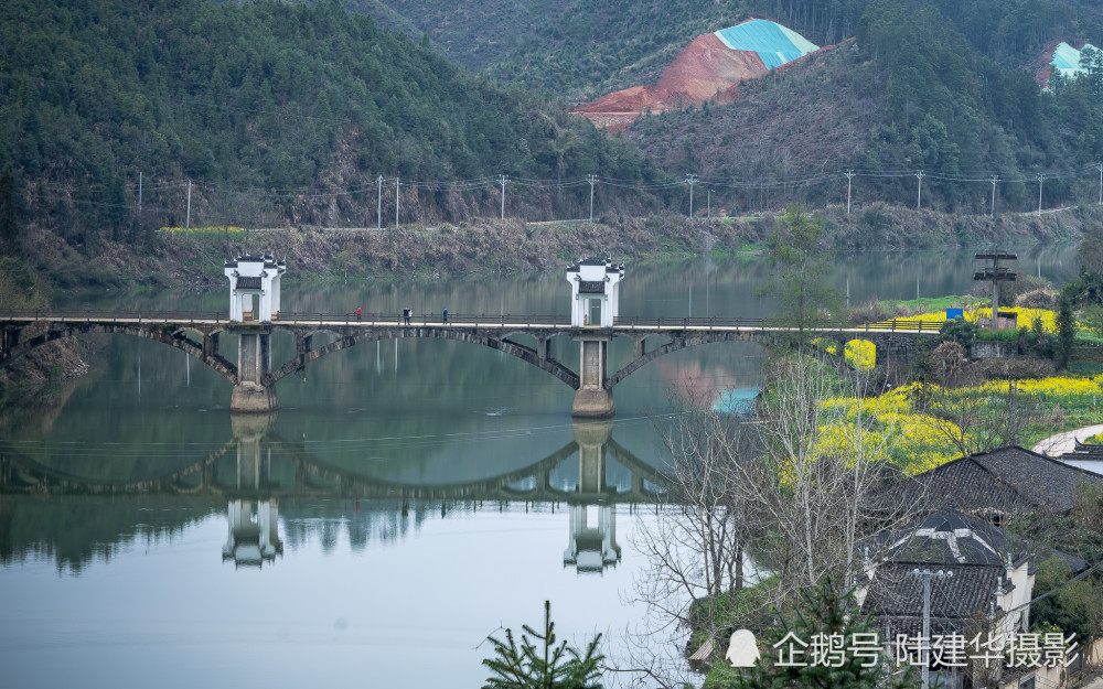 I found this ancient village because when I went from the county seat to Qinghua Town, I needed to climb a ramp just in front of the village. When the vehicle reached the highest point of the ramp, at the front left of the vehicle, I could see the Wushui River. There is a beautiful three-hole curved bridge, and the reflection of the curved bridge on the river is very clear. Then I saw not only rape flowers but also Hui-style buildings with white walls and black tiles on the side of the curved bridge, which looked old. So he parked the vehicle to the side of the road near the village, planning to walk into the village to see.