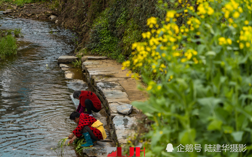 Turning out from the alley is the rape field below the village. The rape blossoms are flourishing, but there are almost no tourists. There is also a creek beside the field, which is invisible when standing on a high slope. Two village women in red coats were washing things in the stream. The water in the stream was so clear that you could see the bottom of the stream at a glance. It is estimated that the stream flowed down from the high slope, because in the end it flowed into the Wushui River on the side of the village.