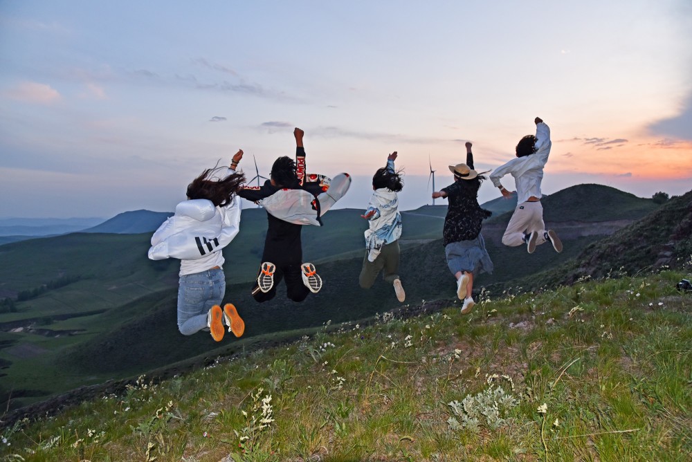 The off-road vehicle drove to the top of a hill, and the driver told us that it was a natural viewing platform. Layers of rocks on the top of the mountain, like a thick book page, record the vicissitudes of geological changes. Moving on, a viewing platform was set up on the hillside, where you can overlook the colorful forest scenic spot, Tianjing Lake and Agate Lake are like two transparent jade inlaid between the green forest grassland. In the afterglow of the setting sun, we took pictures on the hillside and took pictures of the moment of jumping.