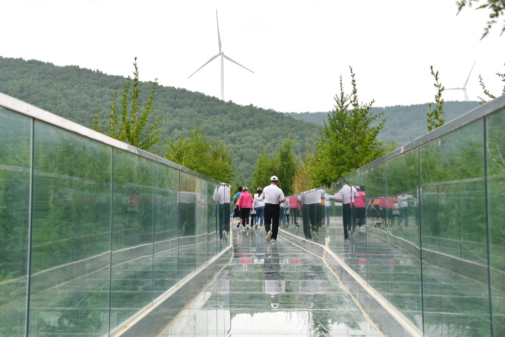 On the edge of the grass, there is a glass sky bridge. Walking on it, you can not only see the scenery on both sides, but also feel the excitement of walking in the air. The height of the sky bridge is similar to that of the trees next to it, so the footsteps on the treetops are vividly named. There is also a dense pine forest at the entrance of the overpass, which is a good place to take pictures.
